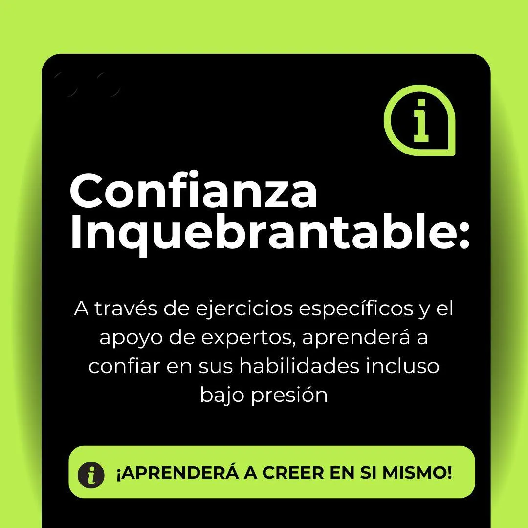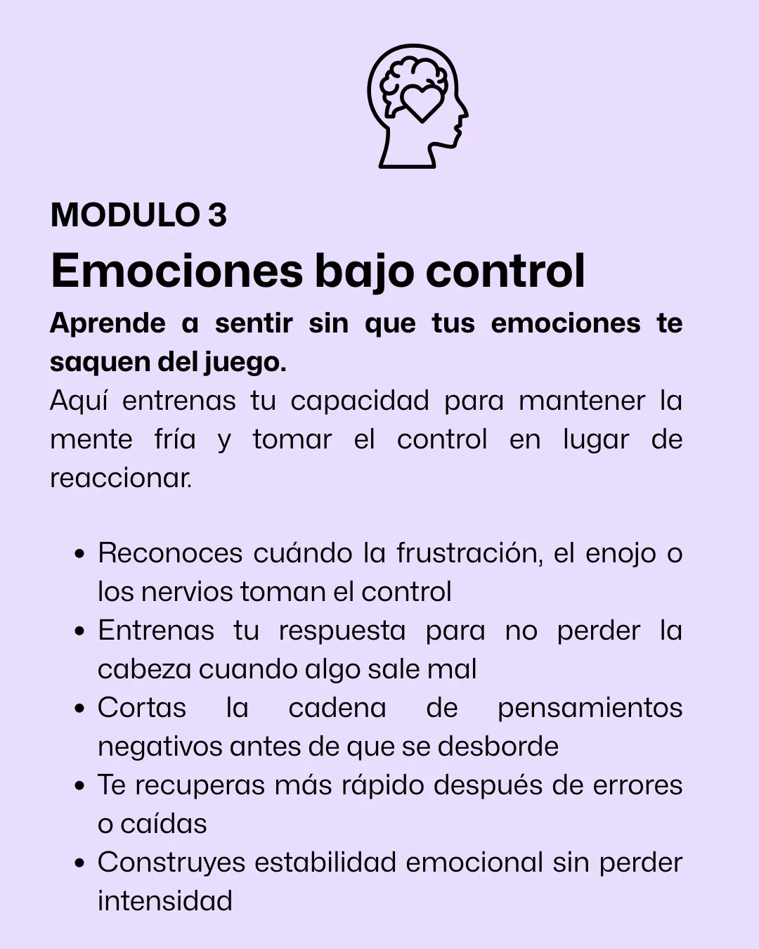 Construirás una confianza solida y entrenarás tu mente para mantener el control emocional incluso bajo presión, sin dejar que los nervios, el enojo o la frustración te saquen del juego.