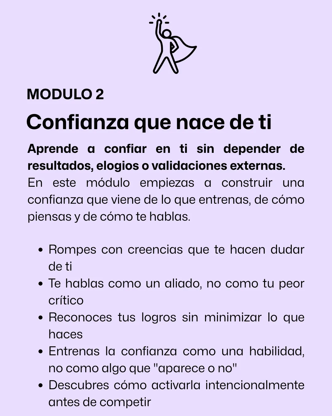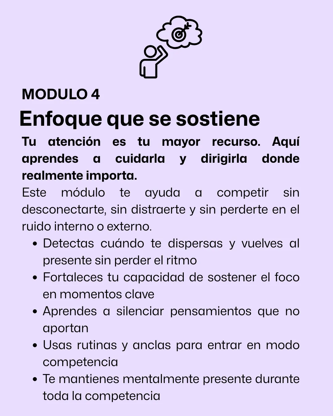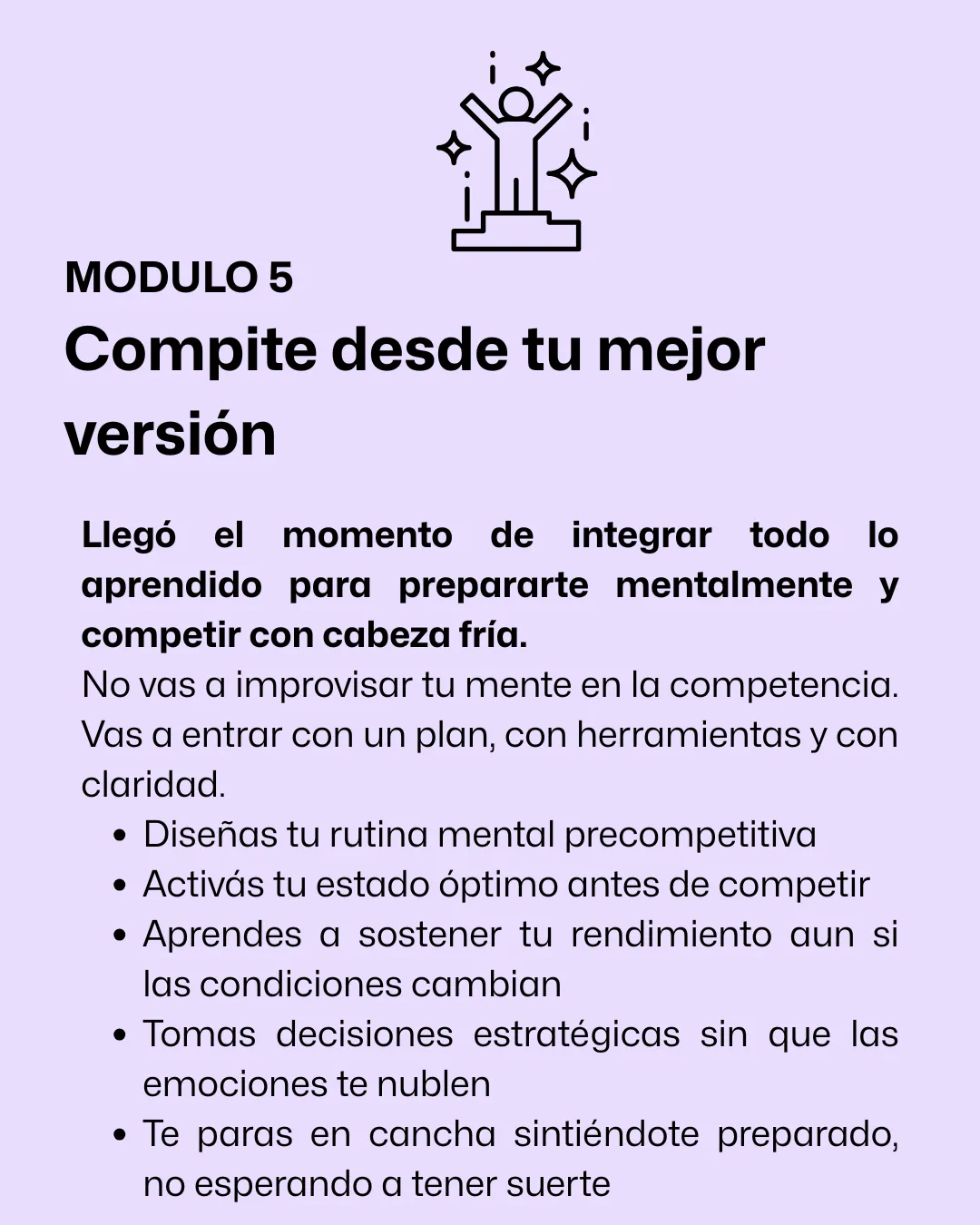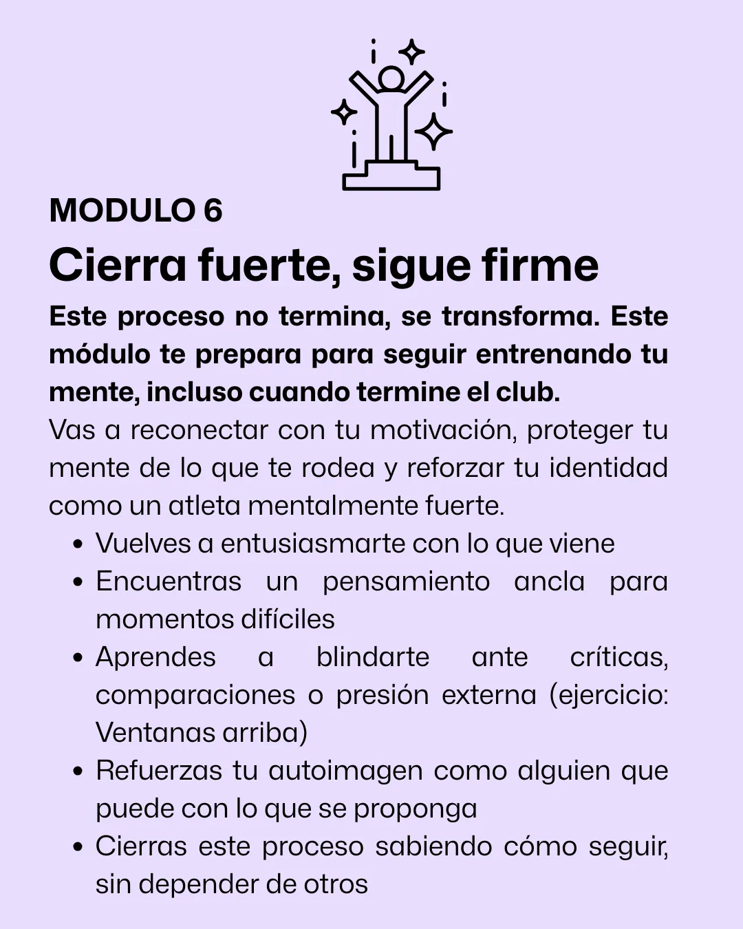 Una ruta estructurada de 6 módulos para entrenar tu mente como entrenas tu cuerpo. Activa tu motivación, fortalece tu confianza, controla tus emociones y compite con seguridad todo el año.